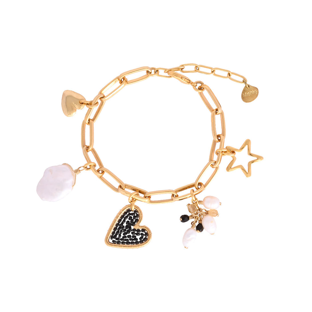 Un brazalete audaz con Zamak bañado en oro, un corazón de cuentas de vidrio negras y perlas blancas. Impactante y seguro—hecho para momentos que marcan estilo.