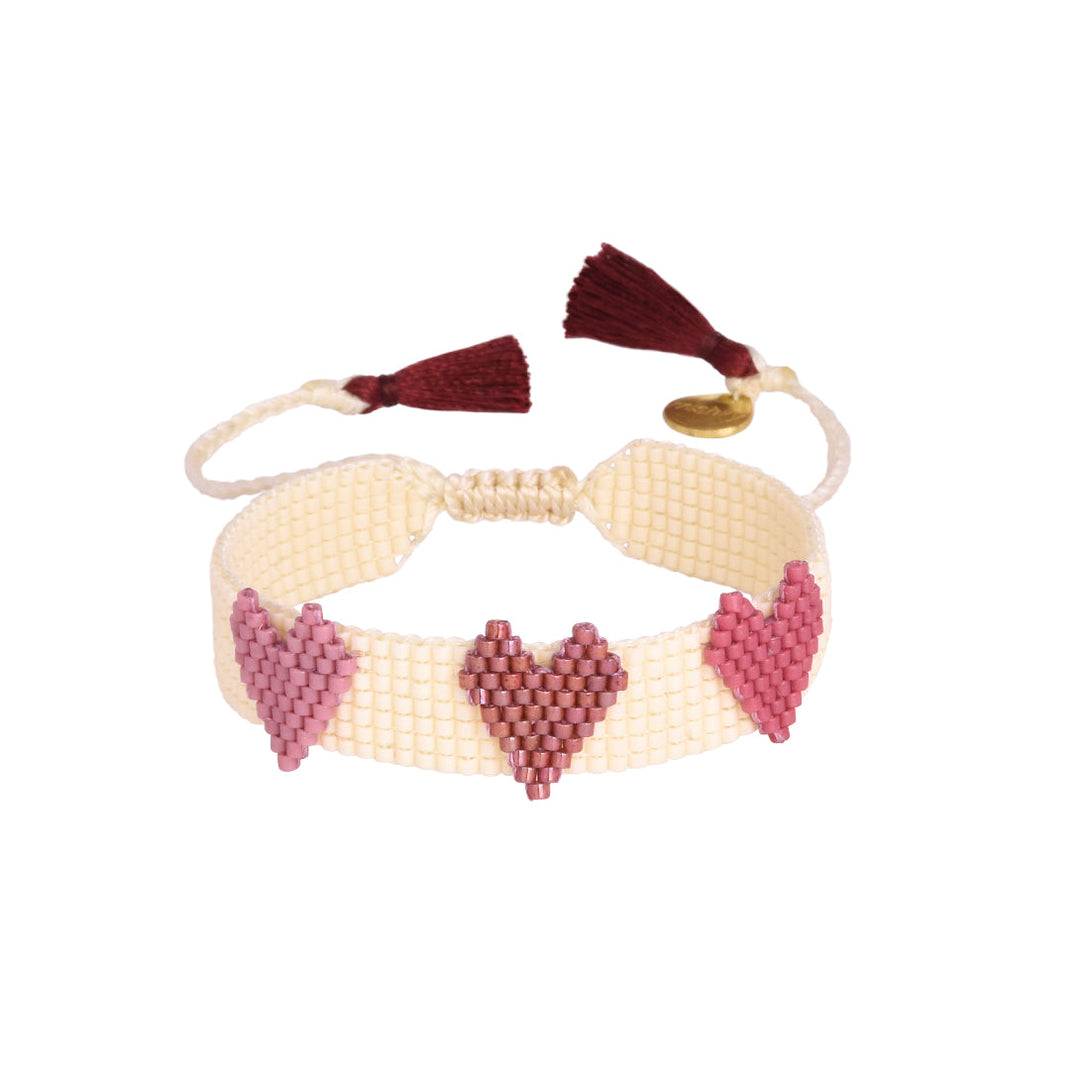 Un brazalete delicado y divertido con tres corazones de chaquiras Miyuki en tono púrpura. Liviano y versátil.