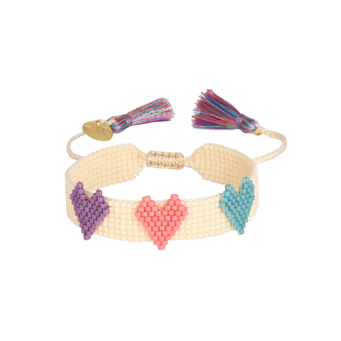 Tres corazones coloridos de chaquiras Miyuki finamente tejidas componen una pieza alegre y apilable. Terminada con el logo de Mishky en bronce bañado en oro para un brillo sutil.