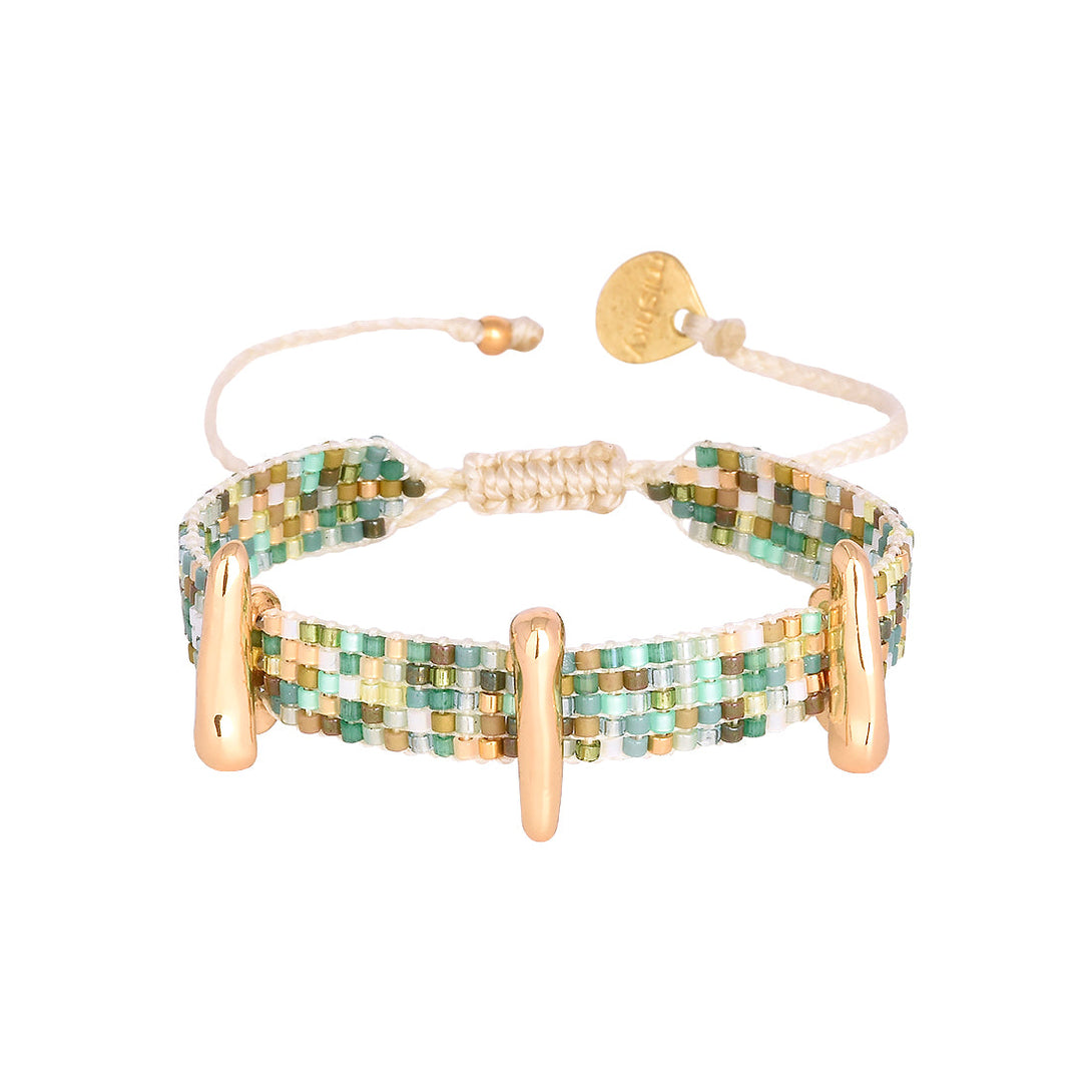 Elaborado con chaquiras Miyuki en tonos verdes intensos y acentuado con Zamak bañado en oro, este brazalete aporta un toque sutil a tus combinaciones diarias.