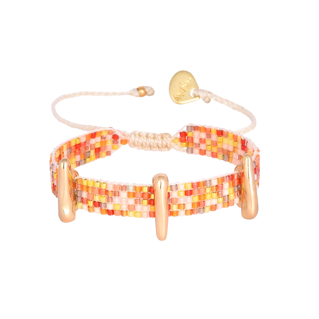 Una mezcla cálida de chaquiras Miyuki naranjas y acentos en Zamak dorado le dan a este brazalete una sensación luminosa y soleada.