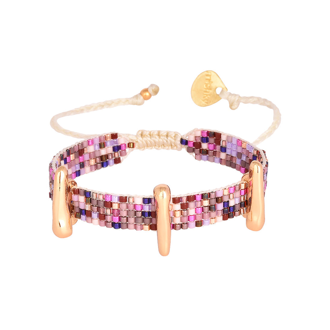 Con chaquiras Miyuki en tonos púrpura y detalles en Zamak bañado en oro, este brazalete aporta un toque de color con un aire sofisticado.