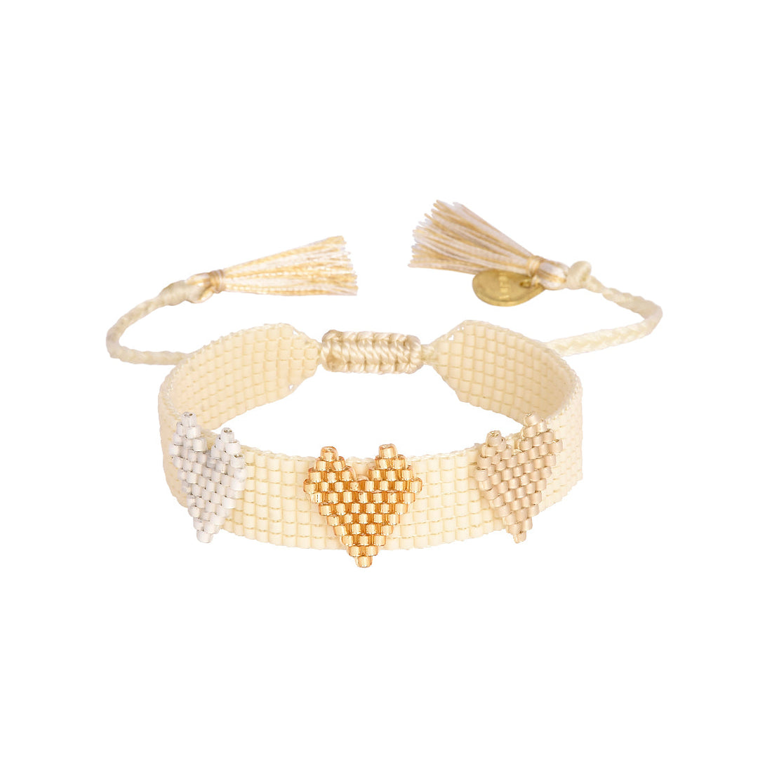 Tres corazones tejidos a mano con chaquiras Miyuki en tono púrpura intenso aportan encanto y personalidad a este brazalete delicado. Con logo de Mishky en bronce bañado en oro.