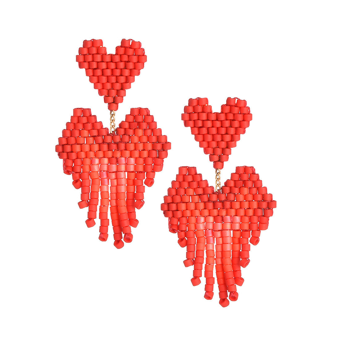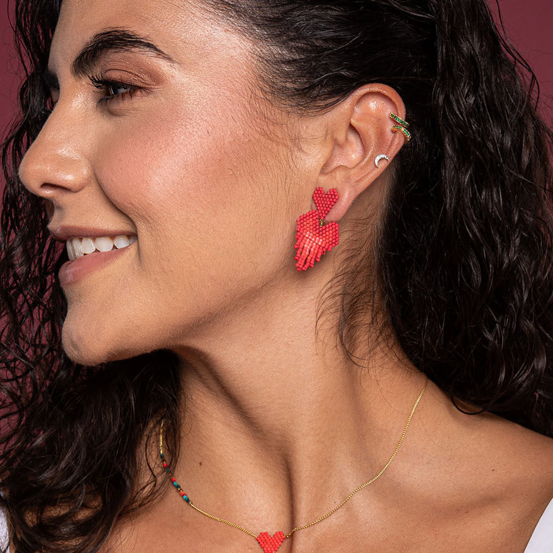 Atrevidos y divertidos, estos aretes con forma de corazón presentan chaquiras Miyuki rojas y cadenas que se mueven contigo. Un accesorio vibrante para añadir personalidad a cualquier atuendo.