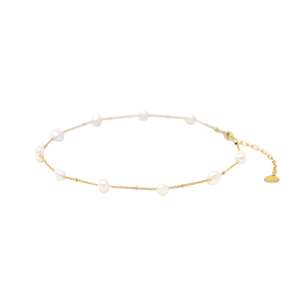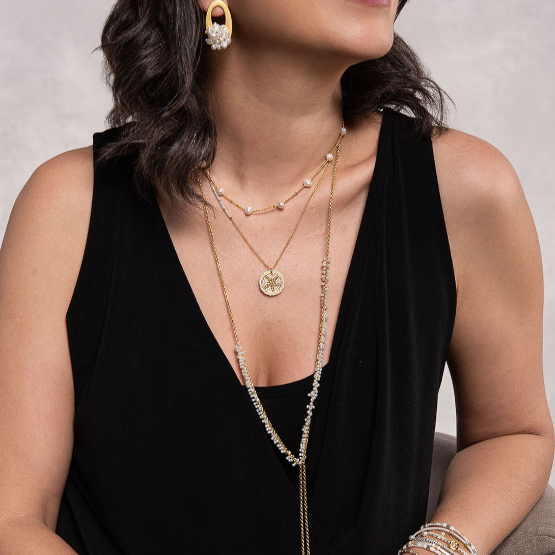 Perlas naturales combinadas con cadenas de bronce bañadas en oro en este collar. Asegurado con un broche a juego y terminado con el logo de Mishky, es una pieza sutil con carácter.