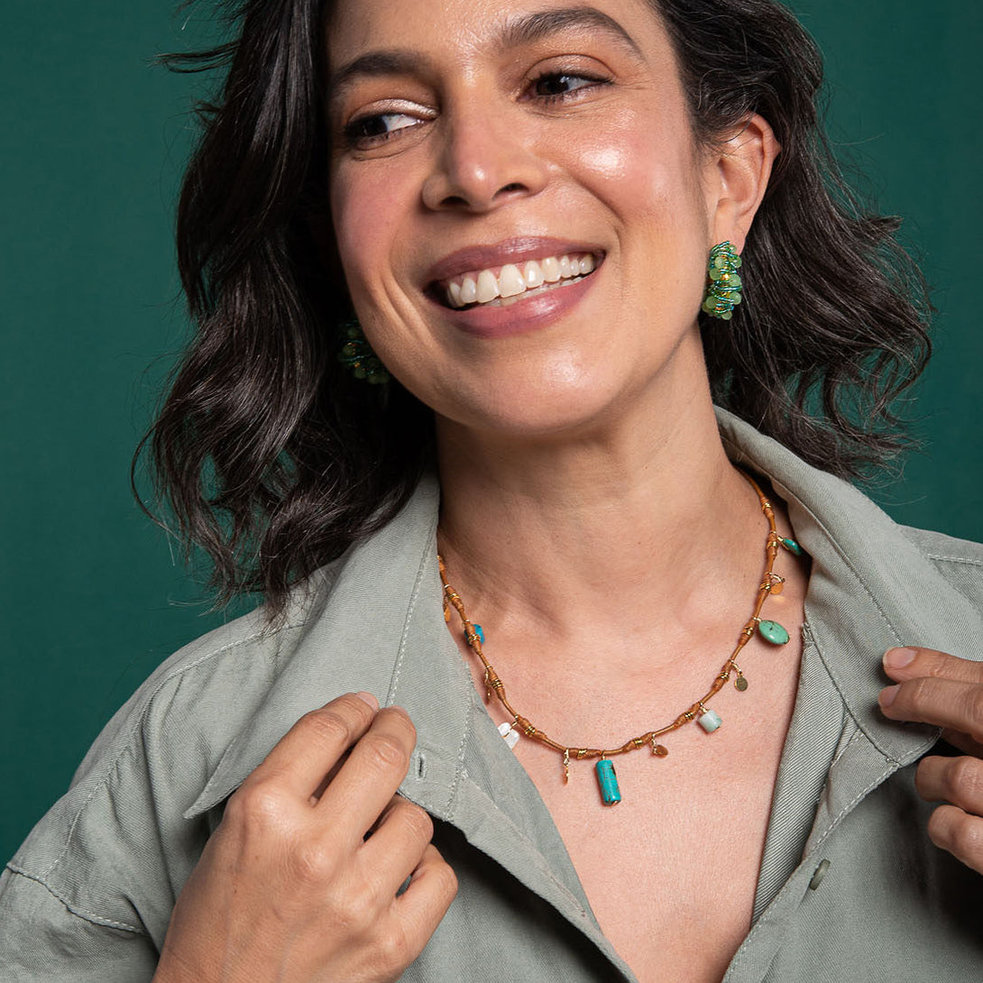 Con piedras semipreciosas, cuero y un aro bañado en oro, este collar reúne texturas naturales y tonos fríos, ideal para añadir profundidad a atuendos casuales o de estilo bohemio.