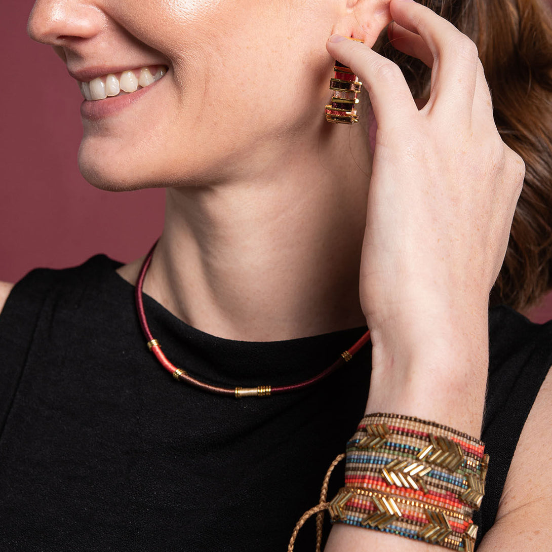 Hilo Silko burdeos y toques dorados se unen en este collar que irradia calidez y riqueza. Ideal para looks en capas o como pieza refinada por sí sola.