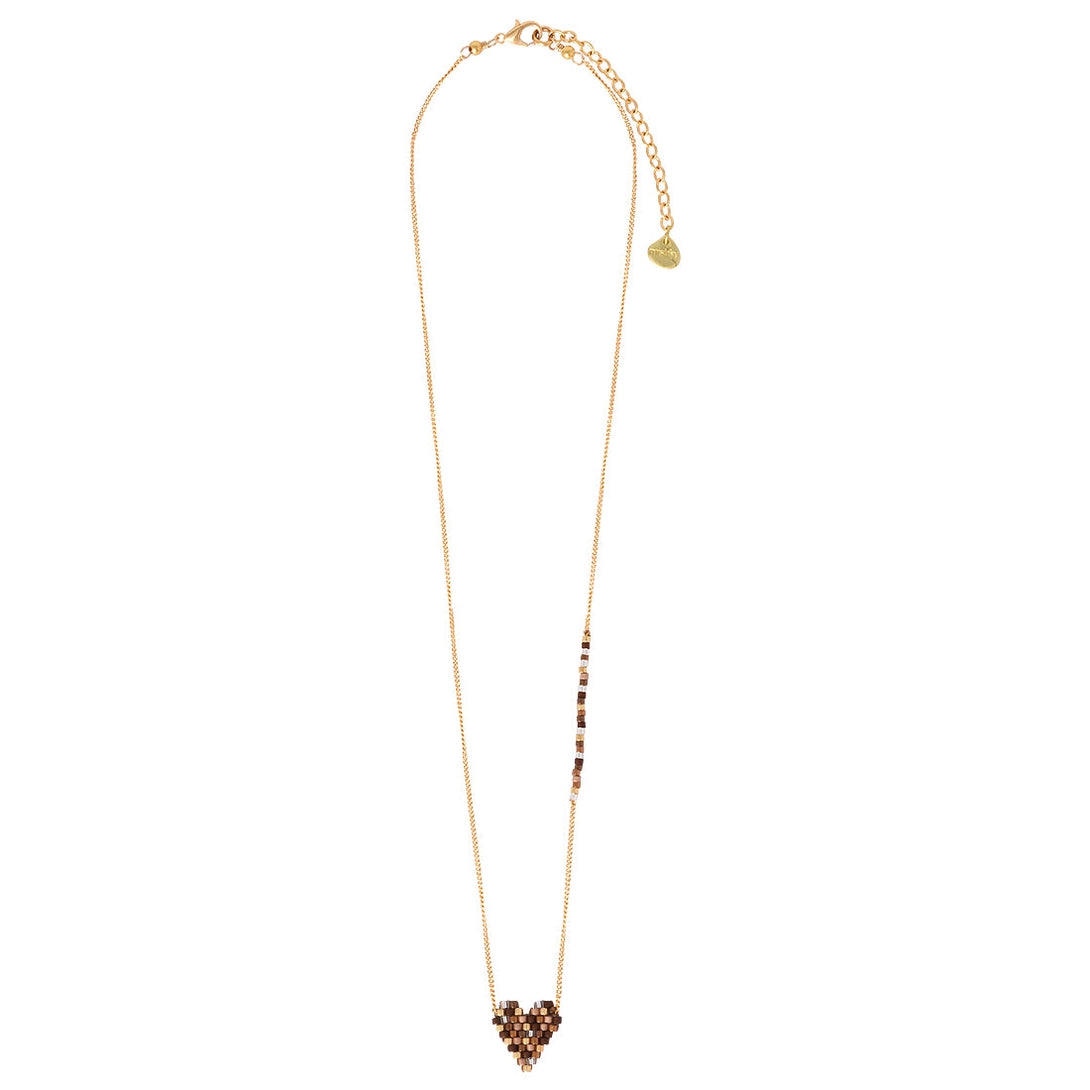 Tonos marrón cálido en el corazón y acabados bañados en oro le dan a este collar un aire sofisticado y con base—perfecto para superponer en la temporada de otoño.
