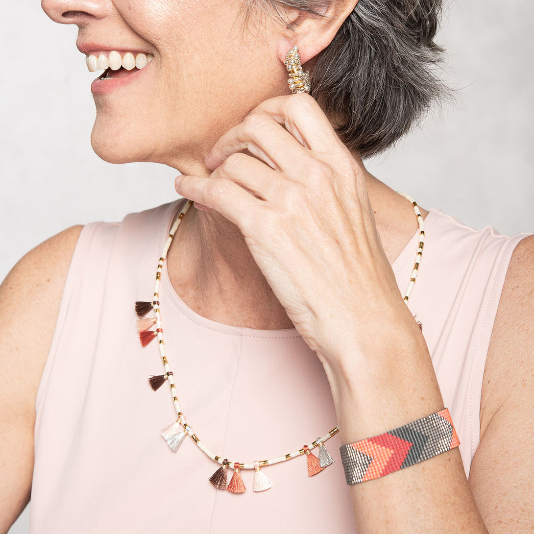 Un diseño en capas que combina chaquiras Miyuki cilíndricas en tonos multicolores vibrantes con cadenas de bronce bañado en oro. Versátil y expresivo, ideal para dar un toque de color a atuendos tanto casuales como más formales.