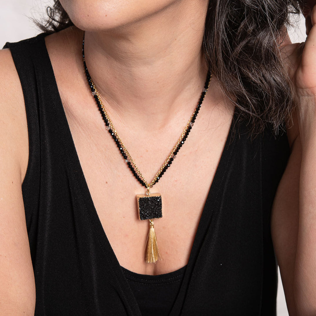 Con un llamativo cuarzo drusa negro como punto focal, este collar ofrece un toque audaz y orgánico a la vez. Perfecto para la noche o para equilibrar un look en capas durante el día.