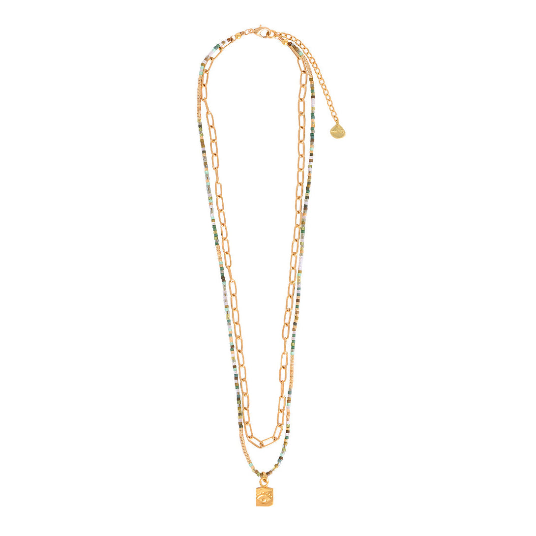 Este collar presenta chaquiras Miyuki verdes y cadena bañada en oro con un dije simbólico de ojo también bañado en oro. Una pieza sutil para protección diaria o para usar en capas.