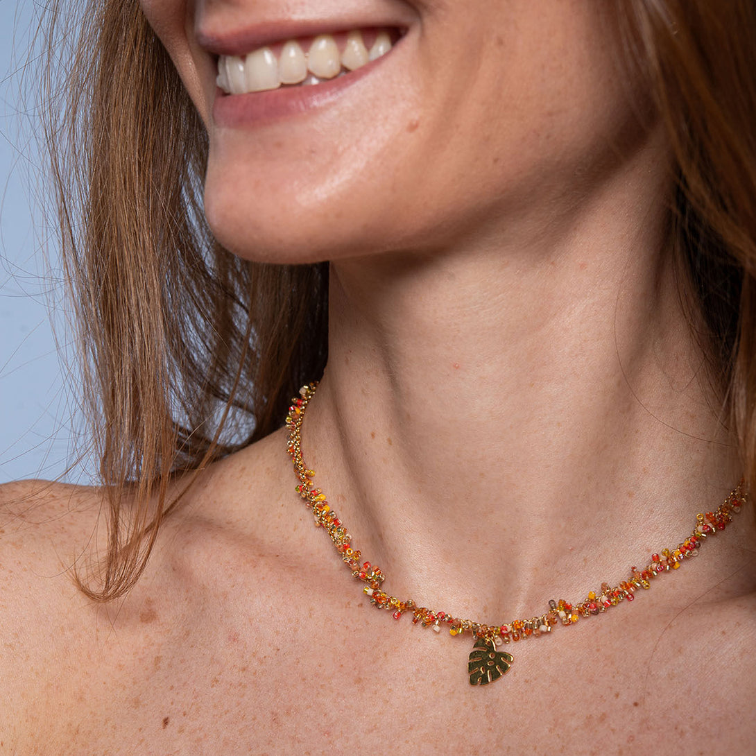 Collar naranja con chaquiras japonesas, cadena y dije de flor bañados en oro. Cálido y vibrante, perfecto para resaltar cualquier look.