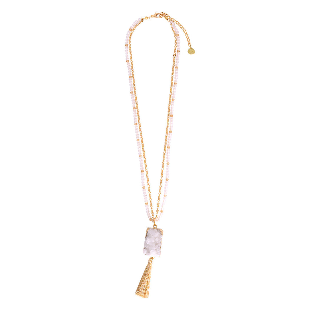 Una versión mediana del collar con cuarzo drusa blanco, que equilibra delicadeza y brillo. Úsalo solo para una elegancia sutil o combínalo en capas para mayor dimensión.